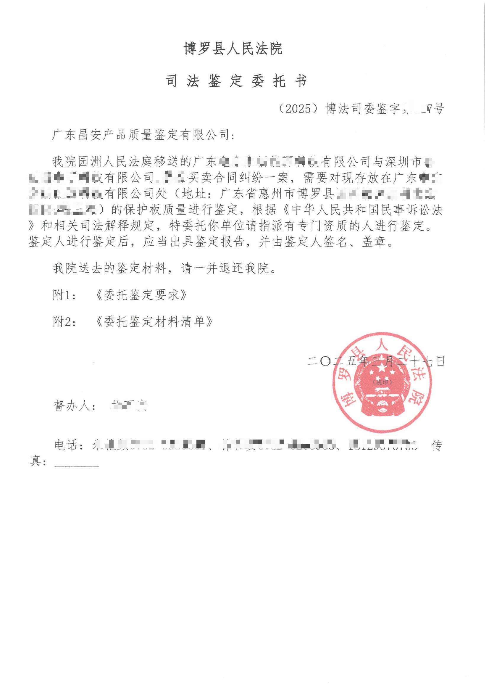 受博罗县人民法院委托,对保护板的质量进行鉴定