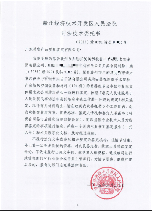 受赣州经济技术开发区人民法院的委托,对新风空调的质量进行鉴定